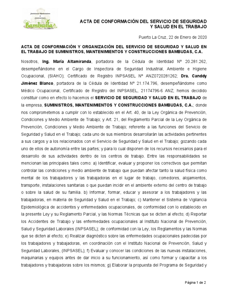 Acta Constitutiva Del Servicio De Seguridad Y Salud En El Trabajo Derecho Laboral Seguridad Y Salud Ocupacional
