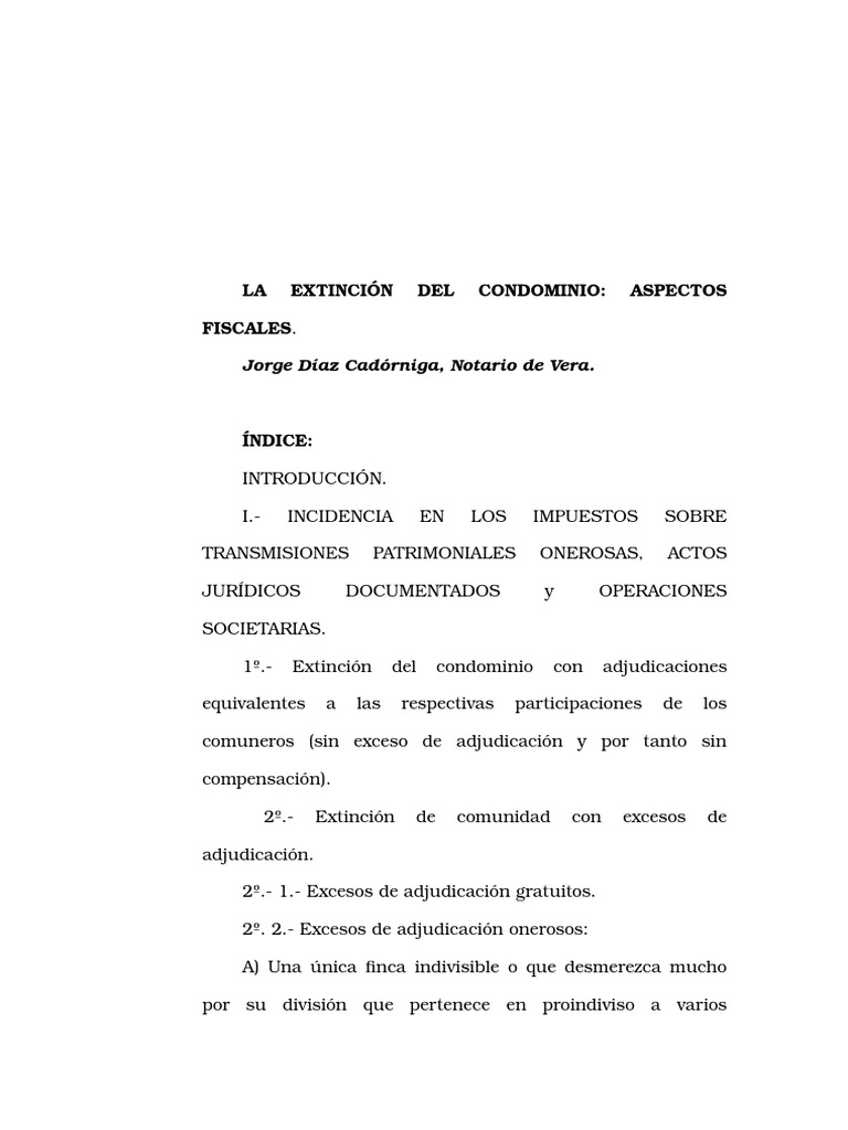 Modelo de escritura en la cual unos copropietarios proceden a la extincin del condominio sobre fincas rsticas y urbanas que estn arrendadas. El contrato de extincin del condominio o copropiedad es un acuerdo adoptado entre las distintas personas propietarias de un condominio copropietarios con el fin de realizar la adjudicacin de todas las cuotas o partes correspondientes a los distintos copropietarios en favor de uno de de ellos adquirente o adjudicatario de un bien que no pueda dividirse fsicamente sin dar lugar a su destruccin. Document Citas 30 Citado por Relacionados.