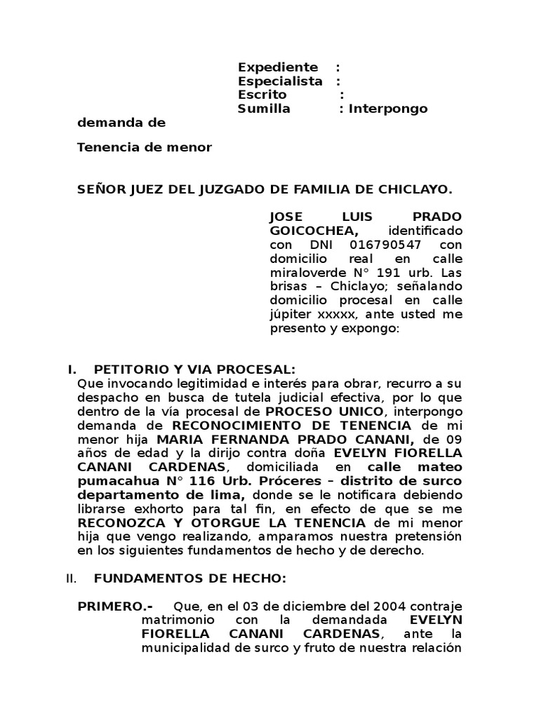 Modelo De Demanda De Tenencia De Menor Demanda Judicial Violencia Domestica