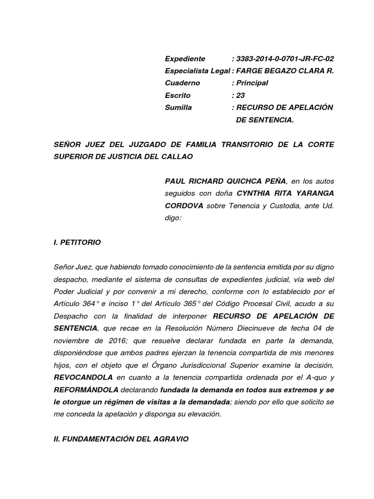 Modelo De Recurso De Apelacion De Sentencia Tenencia De Menor Apelacion Derechos Humanos